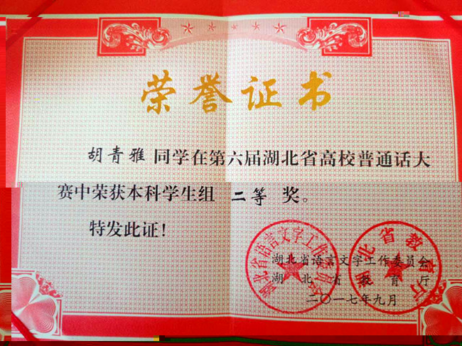 9月15至16日,第六屆湖北省高校普通話大賽在宜昌三峽大學舉行。經過激烈角逐,永利播音與主持藝術專業2014級胡青雅同學獲得本科學生組二等獎,張新剛老師獲得教師組優秀獎。